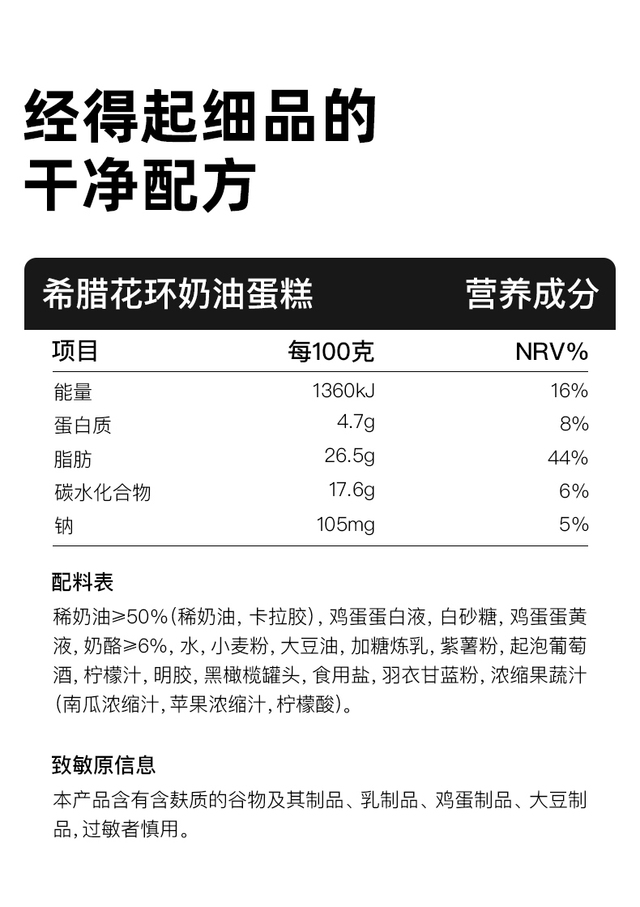 稀奶油>50%(稀奶油,卡拉胶),鸡蛋蛋白液,白砂糖,鸡蛋蛋黄液,奶酪≥6%,水,小麦粉.....