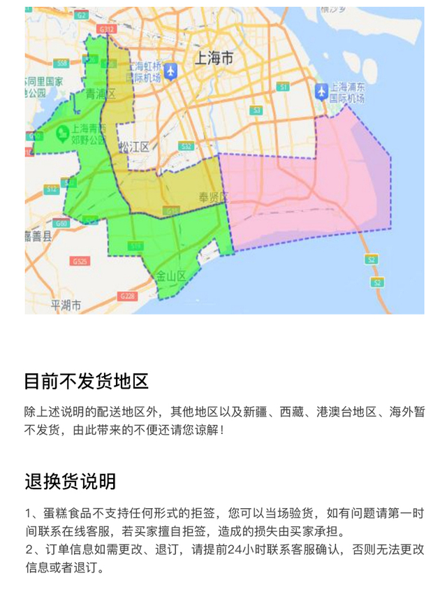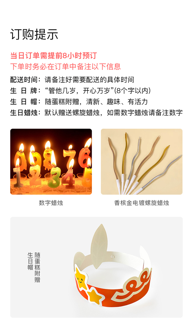 上海市崇明区全区,宝山区-罗泾镇,嘉定区-华亭镇、外冈镇青浦区-金泽镇、练塘镇暂不配送 上海市机场、火车站等各大交通枢纽,以及各大景区暂不配送;详情请联系在线客服。蛋糕带生日帽,备注好需要的数字可以免费送2支数字蜡烛。